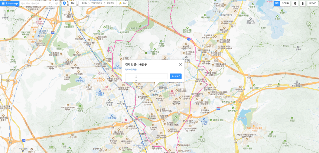 그렇게 하면 위의 사진처럼 안양 동안구가 한 화면에 들어오면서 단지 하나하나가 세세하게 나오게 됩니다.