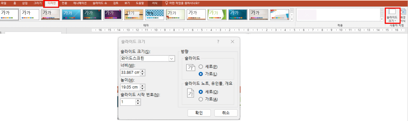 [디자인] - [슬라이드 크기] - [사용자 지정 슬라이드 크기] - [너비, 높이 조정] - [최대화]