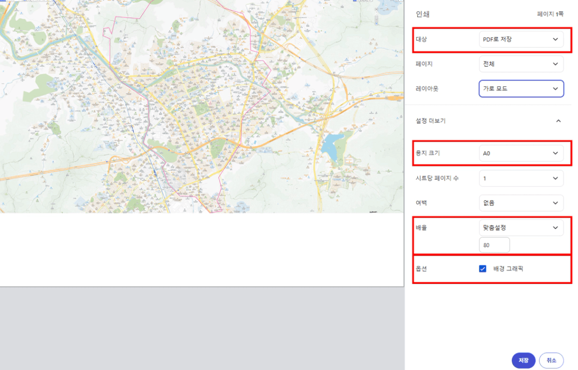 이때 옵션 배경그래픽은 꼭 체크해주세요!(체크하지 않으면 일부 내용이 누락된 지도가 될 수 있습니다.)