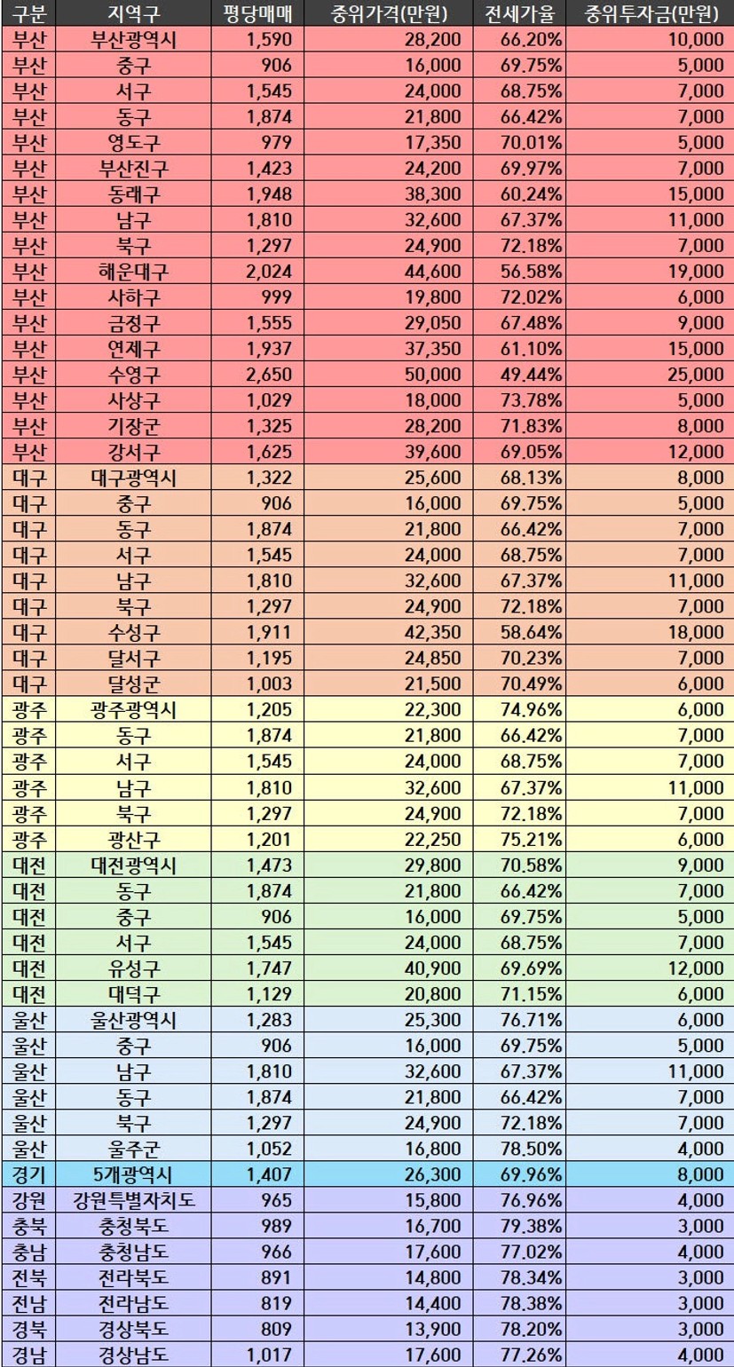 모찌롱님의 양식을 통해 서울/경기권 지역의 중위매매가, 투자금에 대해 올려주셔서 저도 아주 잘 사용했는데요,