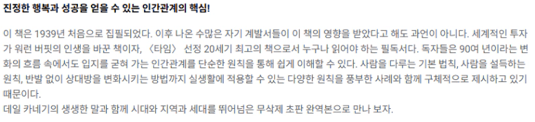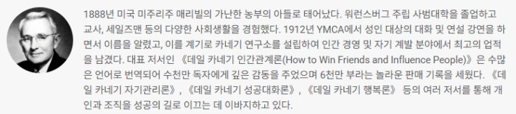 : 이 책은 총 6개 챕터로 분류되어 있다. 사람을 다루는 기본 원칙, 타인의 호감을 얻는 6가지 비결, 상대방을 설득하는 12가지 비결, 감정을 상하게 하지 않고 상대를 변화시키는 9가지 비결, 기적을 일으킨 편지들, 결혼 생활을 행복하게 만드는 7가지 비결로 구성되어 있다.