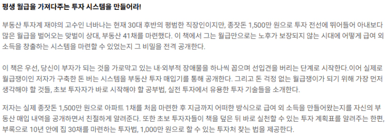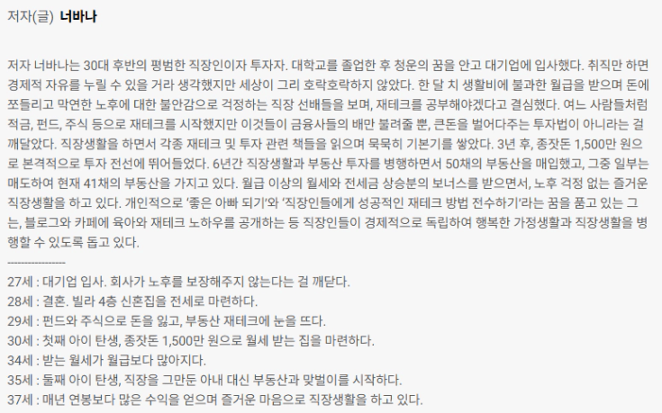 : 30대 평범한 직장인이 소액으로 경매, 오피스텔투자, 상가투자, 아파트 시세차익형 투자를 하면서, 얻게된 경험과 지혜를 알려주는 책입니다.