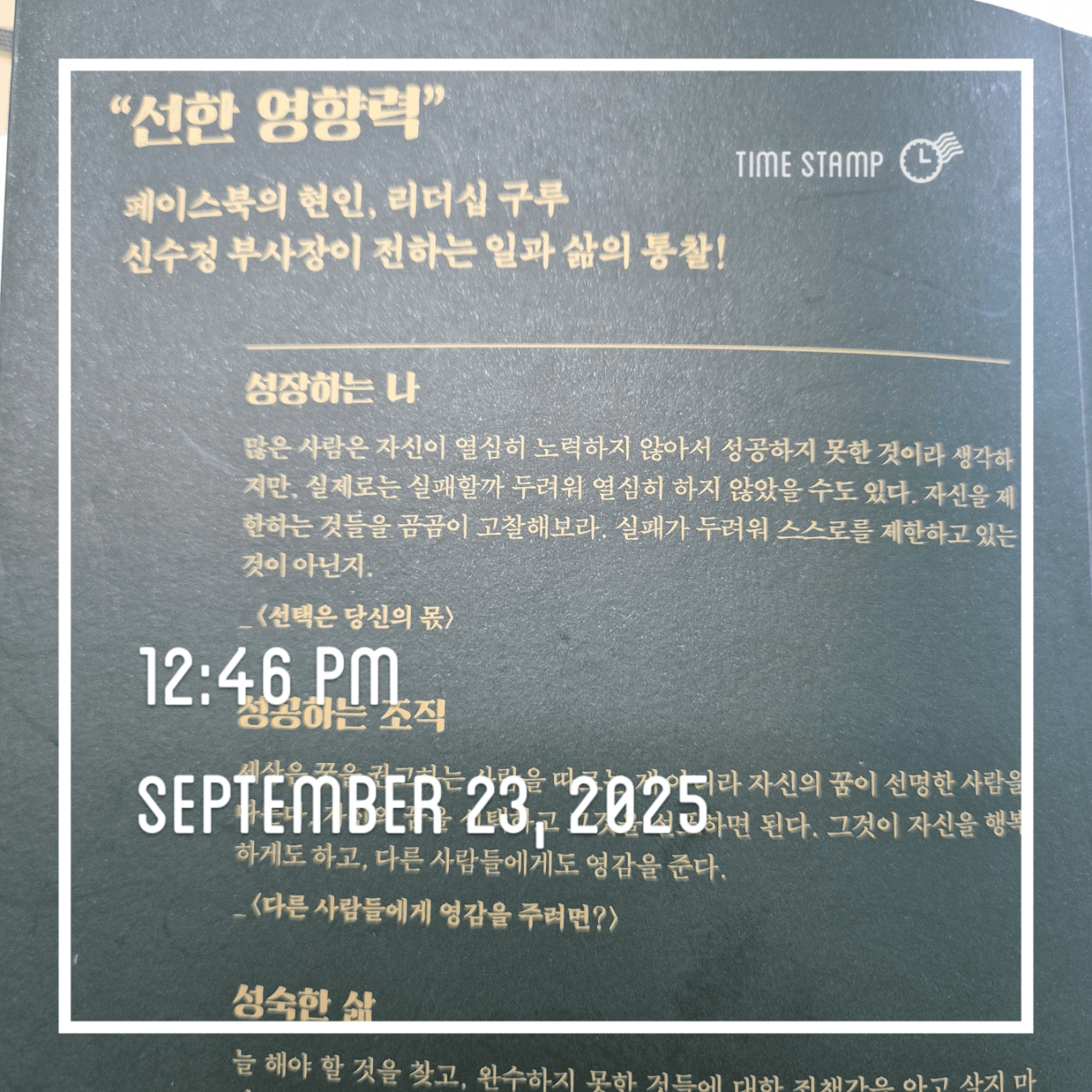 일을 한다는 것은 자신의 성장과 깊은 연관이 있다. 성장하지 않는 다는 것은 정체된 것이다. 성장을 위한 노력을 통해 자신의 성장과 더불어 사회의 성장도 가져올 수 있다. ‘축적 후 발산’을 이루어야 하며 축적하는 시간은 꼭 필요하다. 자신의 성장을 이루어 리더가 된다면 다른 이의 성장을 도와야 하며 그 과정을 통해서 자신의 성숙을 이룰 수 있다. ‘이타심’은 ‘이기심’과 연관이 있기 때문이다. 성숙한 삶이란 균형을 이루는 삶이라는 생각이 든다. 개인의 삶과 사회적인 삶. 그리고 나와 타인 사이에서의 균형, 성공을 위해 달리는 시간과 멈추어 숨고르는 시간. 모든 것이 균형을 이루어야 한다. 그러한 균형을 갖추기 위해서는 자신의 삶을 자신이 사는 것이 가장 중요하다. 나는 나의 삶을 살아야 한다.