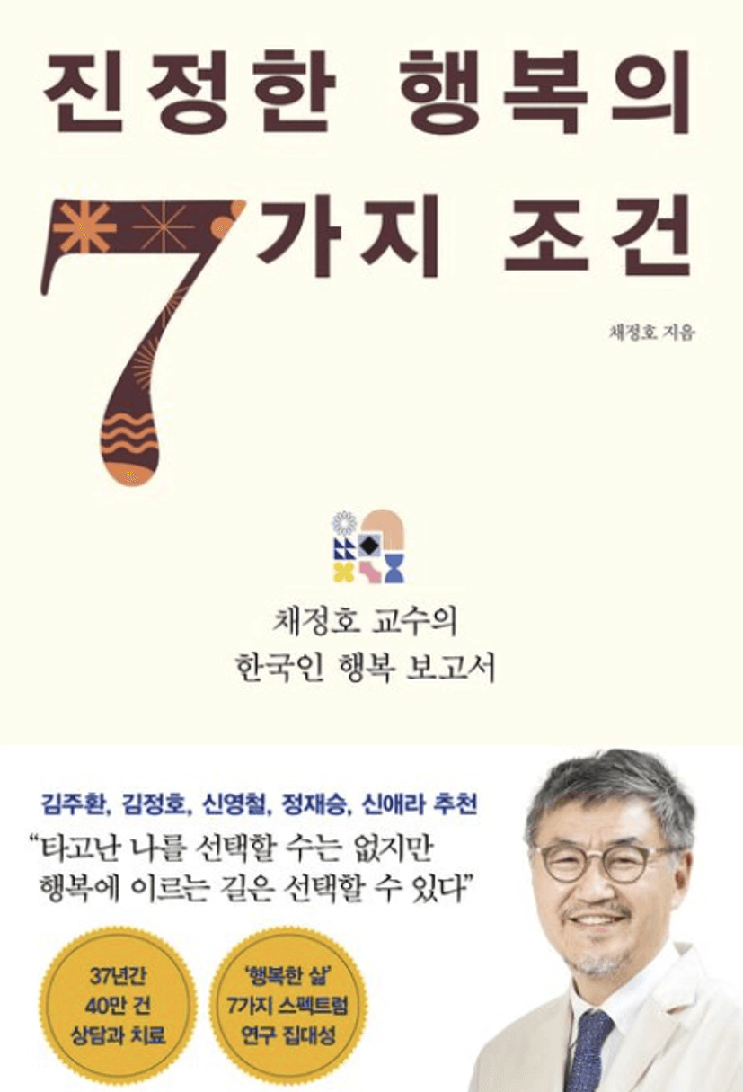 채정호 교수는 40만 건에 이르는 면담과 치료, 일반인 대상 수천 건에 이르는 심층 조사를 통해 삶에서 ‘웰빙’, 즉 진정한 행복을 이루게 하는 7가지 요소를 밝혀냈다. 책에서 소개하고 있는 7가지 요소는 이미 논문으로 수차례 발표한 바 있는 연구 결과를 대중적 시각으로 재구성한 것이다. 특히, 지나치게 성취지향적이고 스트레스 상황에 많이 노출된 한국인의 특성에 맞춰 기존 긍정심리학을 비롯한 여러 정신건강 이론들을 보완했다. 책에서 제시한 잘 사는 삶을 위한 7가지 요소를 통해 진정한 행복이 무엇인지, 어제보다 나은 오늘을 살려면 어떻게 해야 하는지 단초를 찾을 수 있을 것이다.