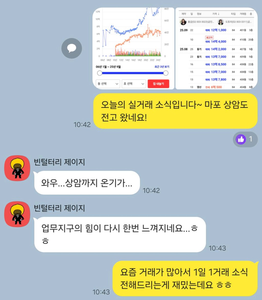 매일 실거래 알림을 받으면서 유의미한 거래가 있다면 동료들에게 공유하기도 합니다.