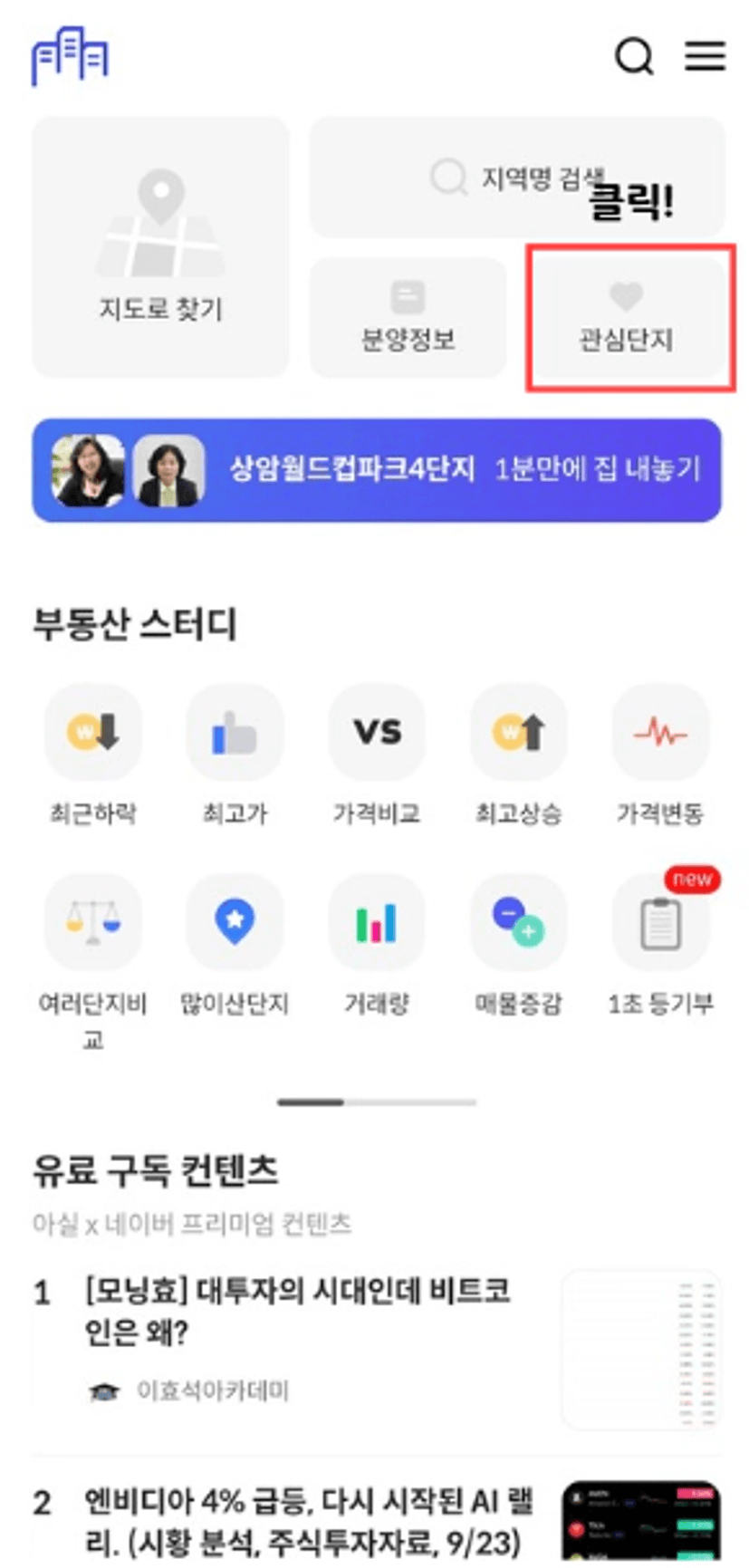 먼저, 아실 어플을 설치한 후 등록을 위한 단지를 검색하고 ‘관심단지’로 설정합니다.
