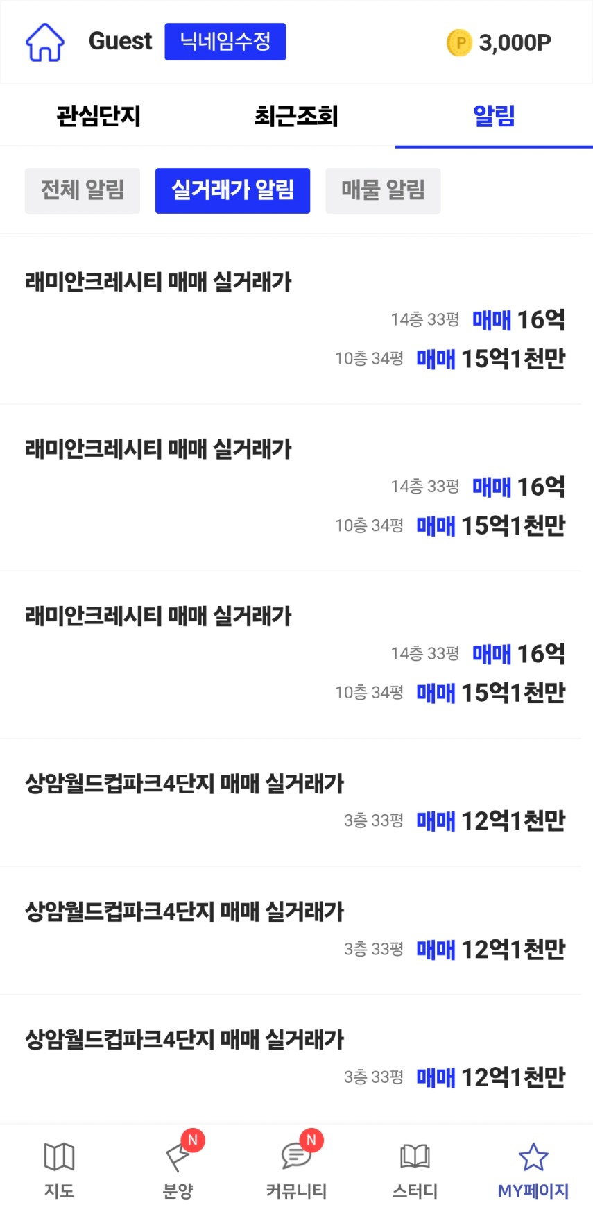관심단지 등록 및 알림 설정을 마무리했다면 아래와 같이 실거래 알림이 울리고 실거래 등록 현황도 살펴보실 수 있습니다.