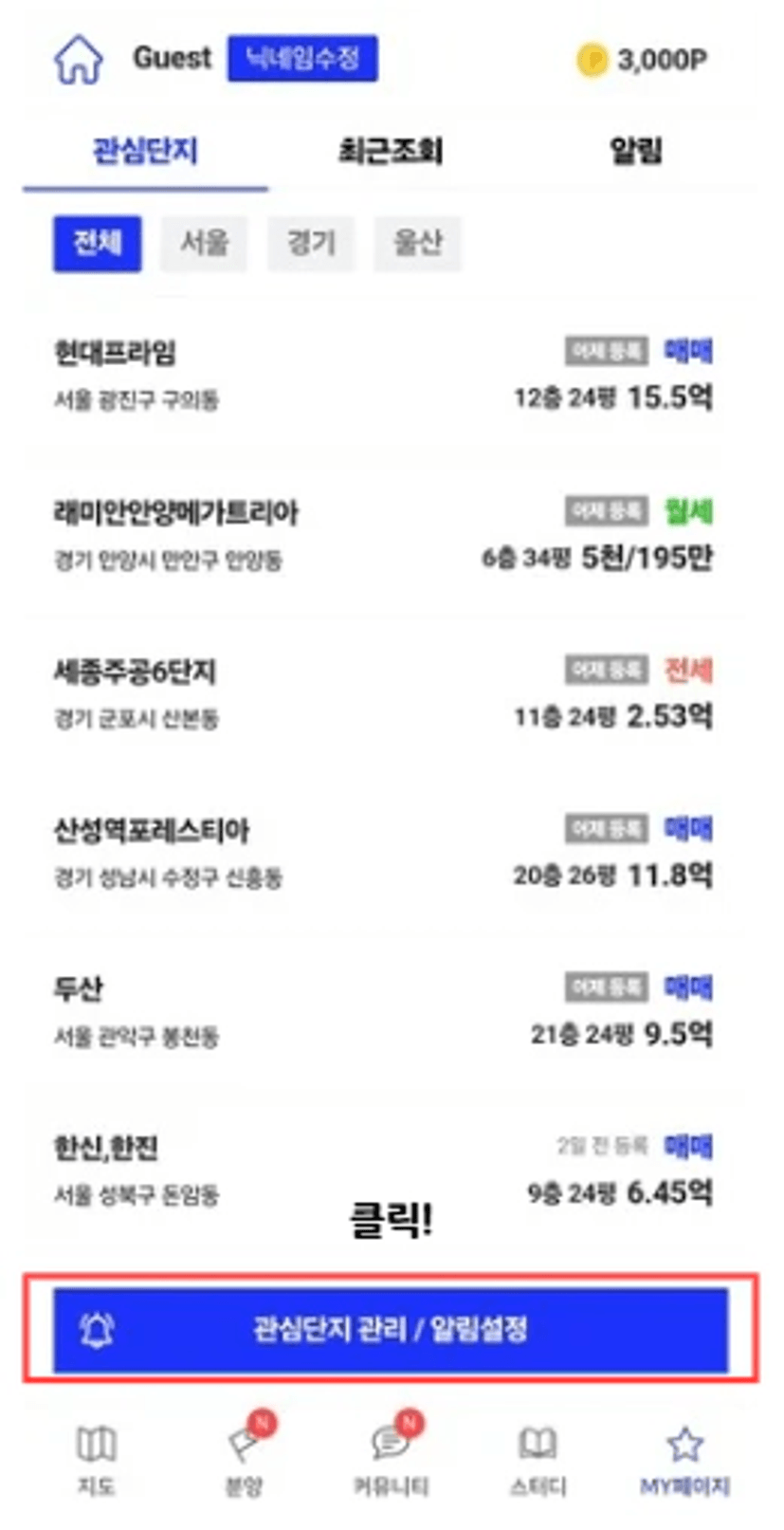관심단지 등록을 진행했다면 아래 그림의 순서대로 관심단지 알림 설정을 진행합니다.