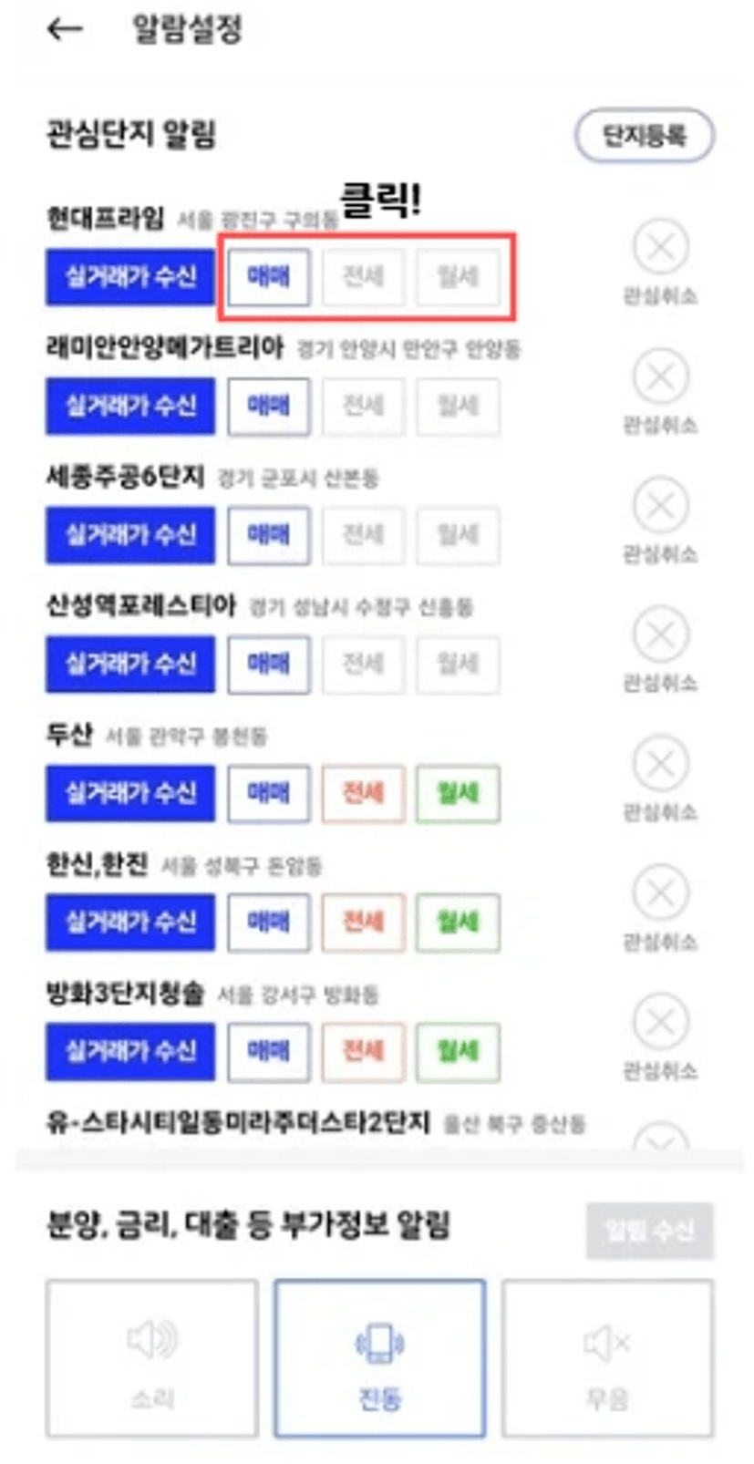 ‘매매’, ‘전세’, ‘월세’ 실거래 알림을 각각 설정할 수 있고 목적에 맞게 단지별로 알림 설정을 진행합니다.
