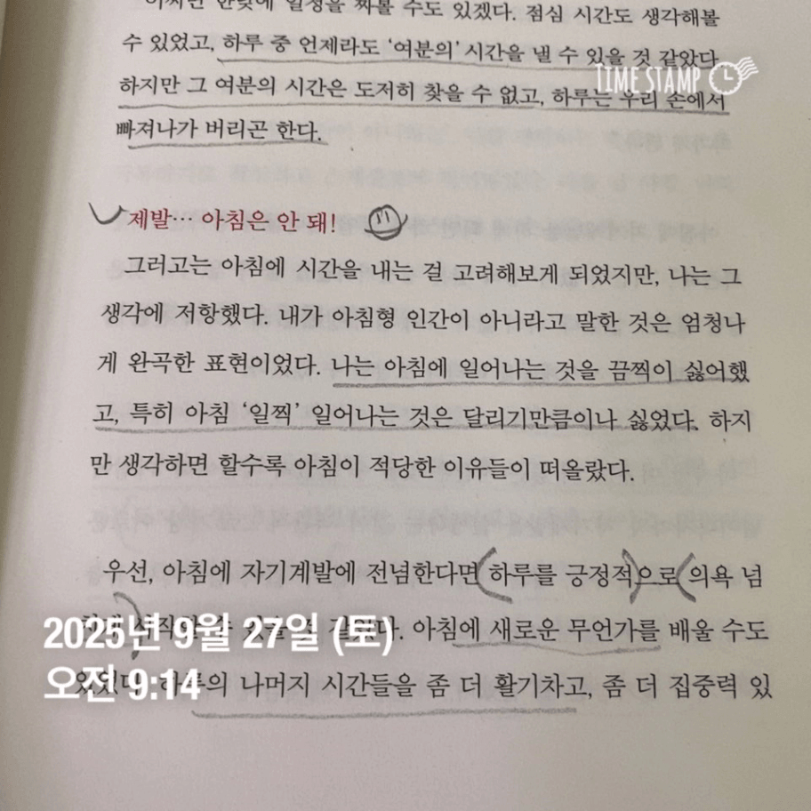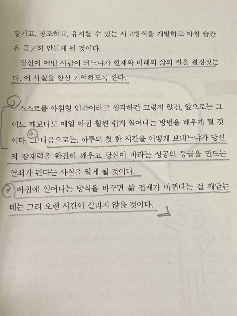 → 재독 : 미라클 모닝의 방법보다는 미라클 모닝을 실천하는 마음가짐에 더 초점을 맞추게 된다.