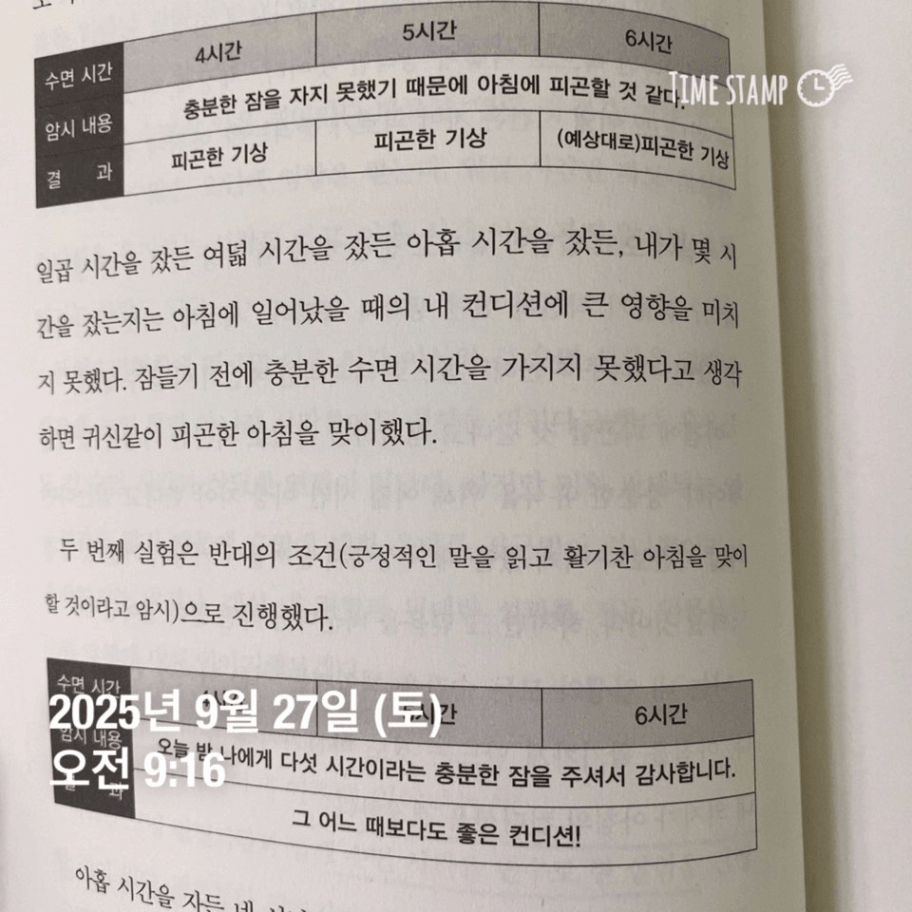 - 수면시간에 대한 진실 : 수면 시간을 변수로 한 실험 → 수면 시간이 아니라 의지가 컨디션을 좌우한다.