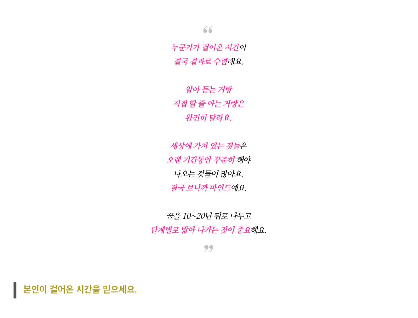 너나위님께서 이 이야기를 해주신 것은 결국 현재를 열심히 살아야 하며 그 결과가 지금 당장이 아닌 40,50,60대에 나타난다는 것을 본인이 직접 경험하고 있기 때문이라 생각합니다. 앞단에 열심히 살아온 사람만이 그 시기가 되었을 때 결과를 얻고 본인이 목표한 바를 이룰 수 있는거라 생각합니다. 그렇기에 지금이 얼마나 중요하고 현재 본인이 어떠한 삶을 살고 있는지를 다시금 반추해봐야 한다는 생각 역시 들었습니다. 목표는 거창하고 원대하면서 정작 본인이 하고 있는 생활 패턴이나 행동들이 전혀 목표와 걸맞지 않은 것이라면 본인의 인생에 대해 다시금 잘 생각해 봐야 하는 것입니다. 원하는 것이 있다면 지금 당장 쉽지 않은 길을 가고 있다고 느끼더라도 그러한 것들이 결국 본인을 원하는 곳으로 데려다 줄 수 있다는 것을 알아야 할 것입니다.
