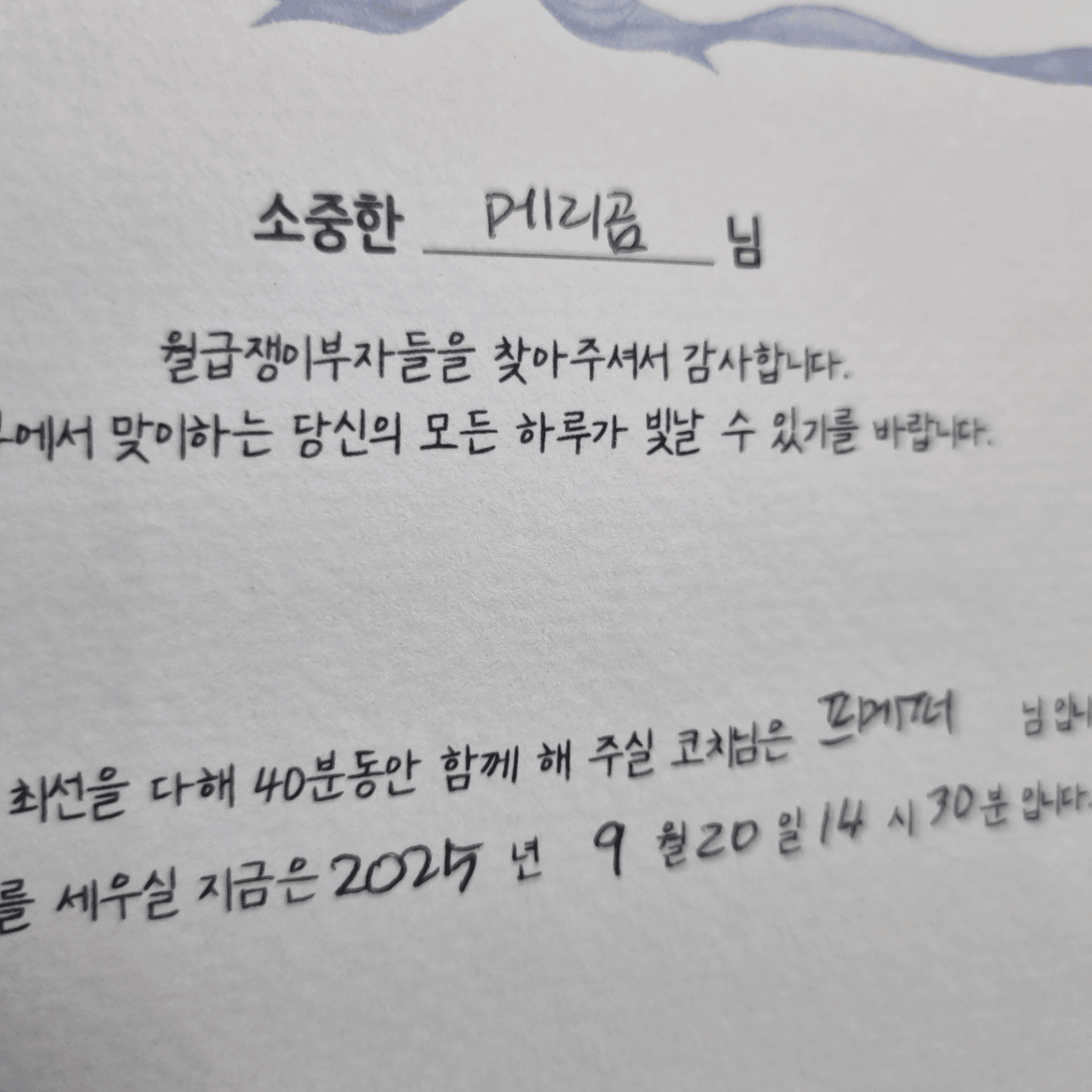 무엇보다 코칭 마지막에 그 누구한테도 듣지 못했던 위로와 힘을 주셨어요.