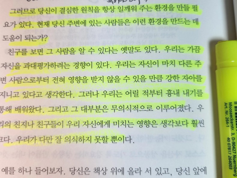 : 당신이 변하지 않으면 아무것도 변하지 않는다. 일이 당신에게 유리하게 바뀌게 하려면 먼저 당신 자신부터 바뀌어야 한다. 당신이 3년, 5년, 또는 7년 안에 지금과 다른 무언가를 하고 싶다면 당신 스스로 변화를 이끌어내고 주도해야 한다. 변화하고 싶다면 시계추처럼 왔다갔다하는 당신의 일상에서 약간의 시간을 떼어내라. 그리고 이시간을 전문가가 되기 위해 준비하는 시간으로 써라. 항상 자신의 목표를 염두에 두고 일하라. 자신을 눈에 띄는 존재로 만들어라. 많은 사람들이 부유하다는 것이 무엇인지 모른다. 돈을 잘번다고 바로 부자가 되는게 아니다. 일반적으로 수입이 늘면 생활 수준이 나아지는 것은 사실이다. 하지만 더 많은 것이 필요하다. 그런데 이상하게도 우린 꼭 버는 만큼 쓰게 된다. 부자가 되는 것은 일하지 않고 자기 돈만으로 생활할 수 있을때이다. 돈은 당신을 위해서 일한다. 당신이 부자가 되는것은 당신이 버는 돈이 아니라 당신이 갖고 있는 돈을 통해서이다. 중단하지 마라. 당신이 이자만으로 살 수 있는 충분한 돈을 모을때까지 수입을 늘려가는 것을 중단하지 마라. 휴식이 필요할때도 있겠지만, 돈으로부터 자유로울때까지는 중단하지마라. 멈춰선 기차를 다시 굴러가게 하는 일보다 더 어려운 일은 없다. 어쩌면 당신은 평생 돈 버는 기계로 살아가야 할지 모른다. 당시신 자신을 위한 돈 버는 기계를 마련하겠다는 단호한 결심을 하지 않는다면 말이다. 황금알을 낳는 거위를 키워라. 당신은 지금까지 이 거위가 얼마나 빨리 자라는지 보았다. 단 거위는 자기를 금방 잡아먹어 버리는 사람에게는 오려고 하지 않는다. 그러므로 당신이 결심한 원칙을 항상 일깨워 주는 환경을 만들 필요가 있다. 현재 당신 주변에 있는 사람들은 이런 환경을 만드는데 도움이 되는가?