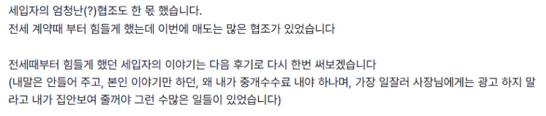 세입자의 엄청난 자기만의 요구, 그리고 부동산 사장님에게 함부로 말하는 등등으로  전세를 빼주시는 사장님과 완전 틀어 졌습니다. 그때까지는 뭐 그럴 수 있지 정도 하고 넘어 갔습니다