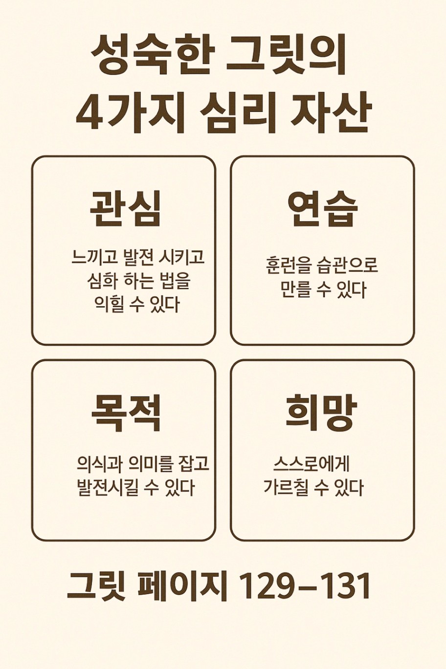 매우 관심 있어서 계속 고수할 용의가 있는 일에 노력을 기울이는 일인 그릿은 성공하는 사람들의 공통된 특징이었다. 그릿을 발전시키기 위해서는 관심, 연습, 목적, 희망이 필요하다. 관심을 느끼고 발전시키고 심화시키는 법을 익힐 수 있고, 훈력과 습관으로 그릿을 만들 수 있다. 의식과 의미를 잡고 발전시킬 수 있고 스스로에게 희망을 가르칠 수 있다.