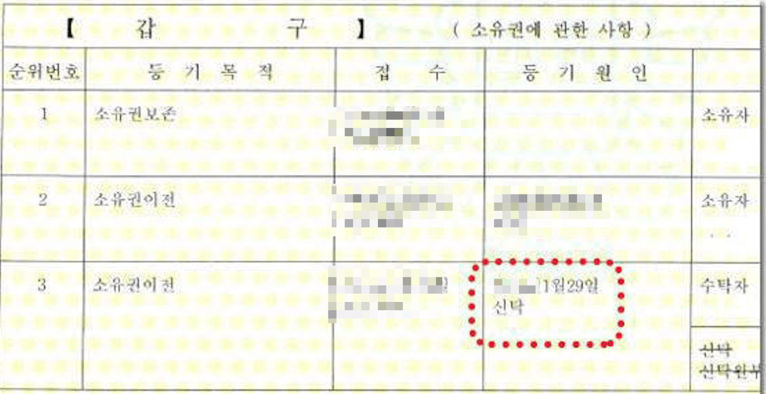 갑구에선 '가압류', '압류', '임의경매', '강제경매', '신탁', '회생절차' 등이 표시되면 위험합니다. 이는 집주인이 돈을 갚지 못해 담보가 잡혔거나, 경매가 실행되거나, 재정적으로 자력이 없다는 뜻이기 때문입니다.