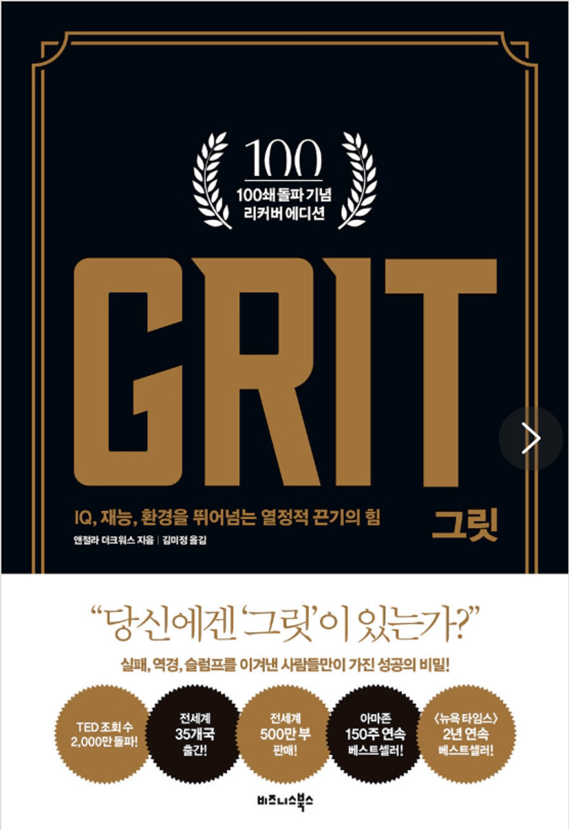 그들은 추호도 포기할 생각을 하지 않았다. 그들의 열정은 오래 지속됐다. 요컨대 분야에 상관없이 대단히 성공한 사람들은 굳건한 결의를 보였고 이는 두 가지 특성으로 나타났다. 첫째, 그들은 대단히 회복력이 강하고 근면했다. 둘째, 자신이 원하는 바가 무엇인지 매우 깊이 이해하고 있었다. 그들은 결단력이 있을 뿐 아니라 나아갈 방향도 알고 있었다. 성공한 사람들이 가진 특별한 점은 열정과 결합된 끈기였다. 한마디로 그들에게는 그릿(grit)이 있었다. - 열정과 집념이 있는 끈기 -