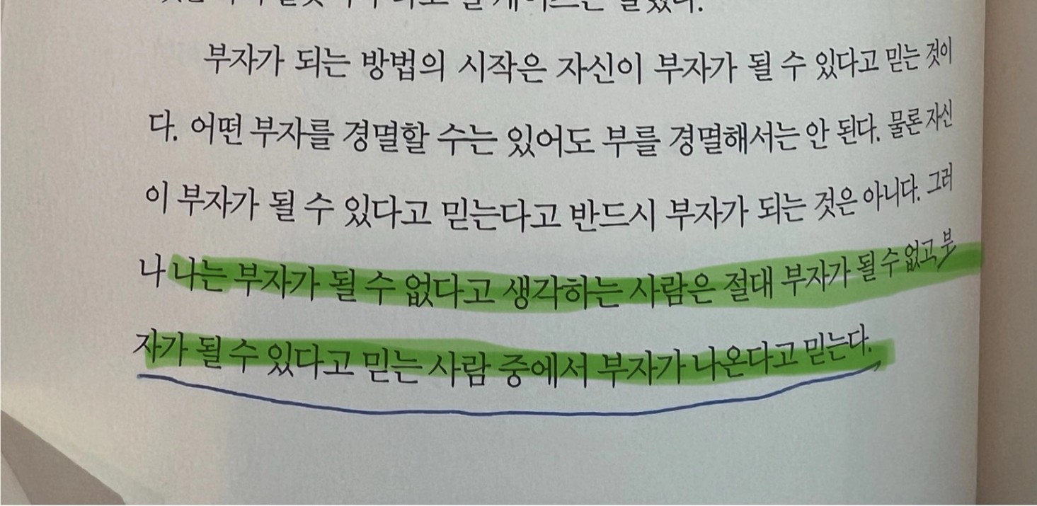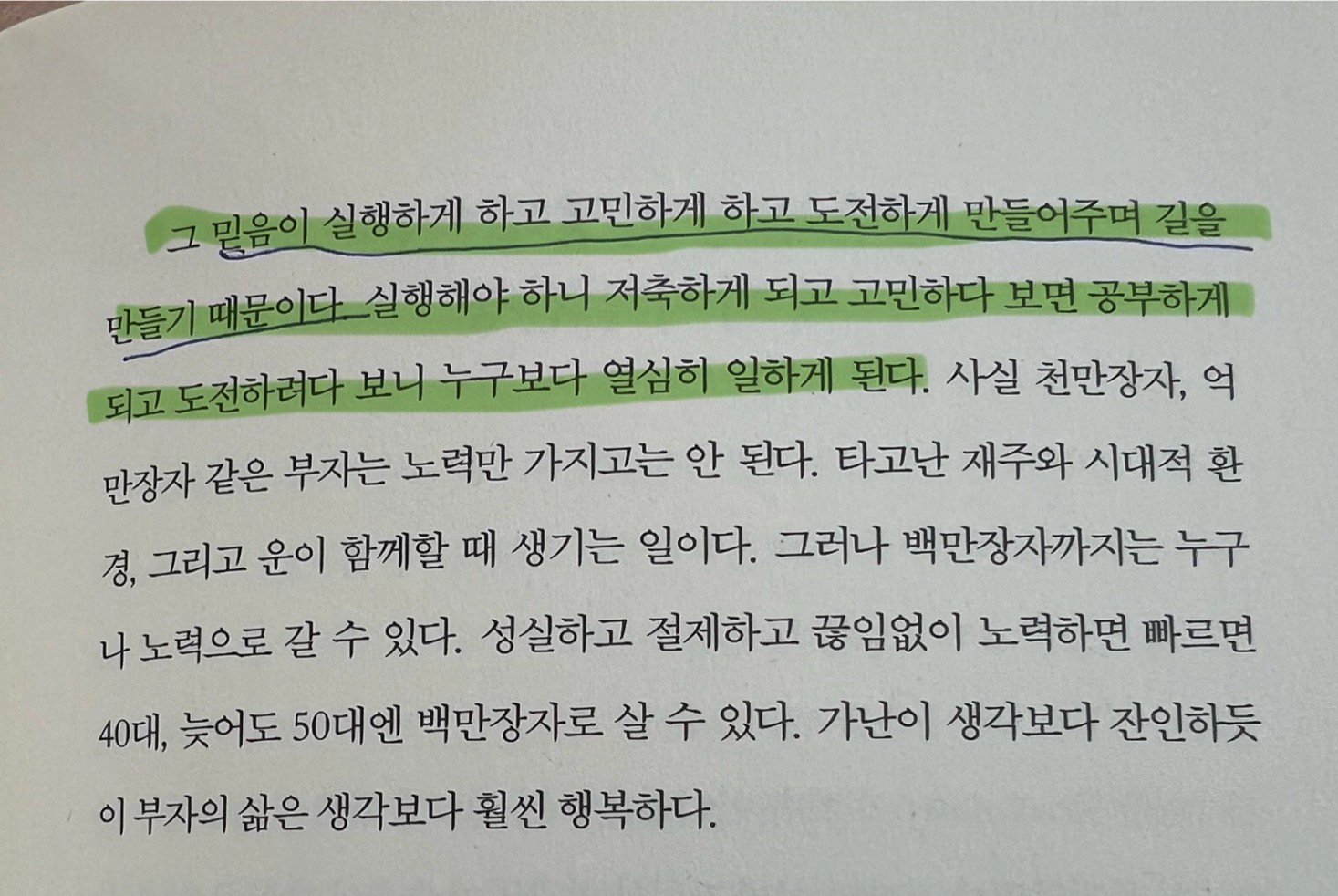 부자가 될 수 있다고 믿는 사람 중에서 부자가 나온다고 믿는다. 그 믿음이 실행하게 하고 고민하게 하고 도전하게 만들어주며 길을 만들기 때문이다.