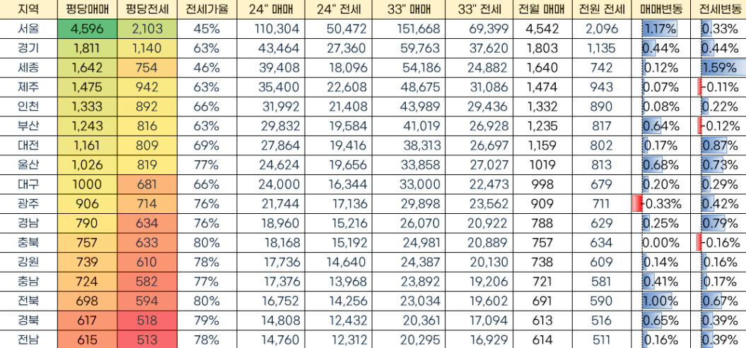 일부 지역을 제외하고는 매매, 전세 전월 대비 상승했습니다.