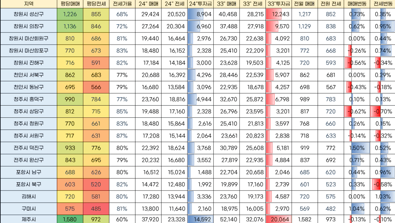 마산합포, 진해, 동남, 상당, 서원, 제주시의 매매가격이 하락했습니다.
