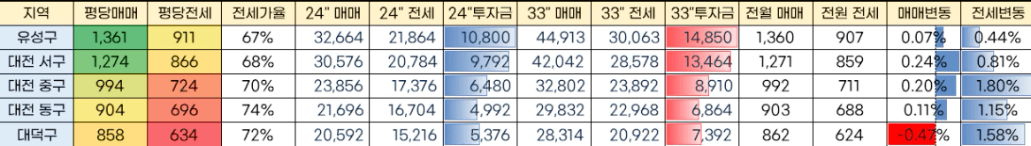 전세는 전 지역에서 상승했고, 중구, 동구, 대덕구가 많이 상승했습니다.