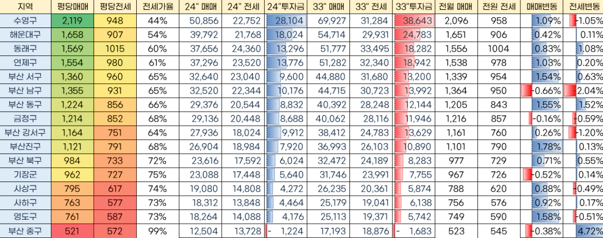 수영구, 연제구, 서구, 동구, 진구, 영도구는 1%이상 상승했습니다.