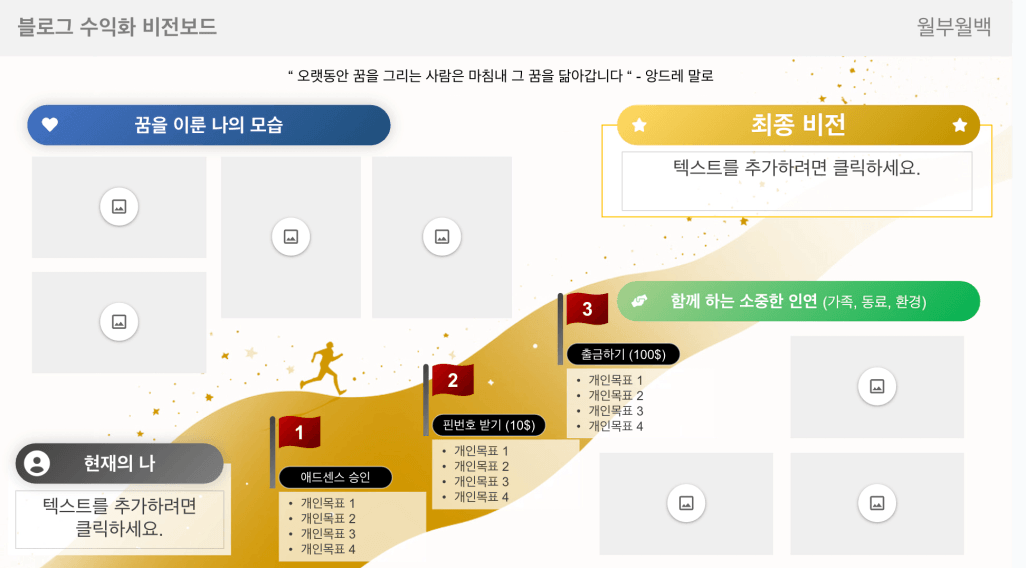 <블로그 수익화로 월 백만원 벌기> 와 같이 큰 목표를 잡고 이를 이루기 위한 작은 목표로
