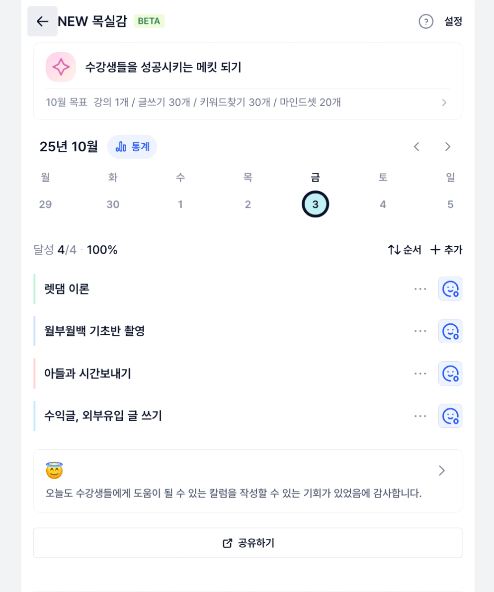 이렇게 현실적인 루틴을 먼저 만들면 꾸준함이 습관이 되고, 그 습관이 성과로 이어집니다. 큰 성취는 작은 루틴에서 비롯된다는 걸 꼭 기억하셨으면 합니다.