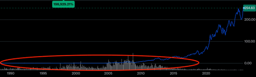 저번에 제이디님이 월부월백 실전반 2기에서도 비유해주신 그래프인데, 위 그래프는 애플의 최근 35년간의 주가추이를 나타내는 그래프입니다.