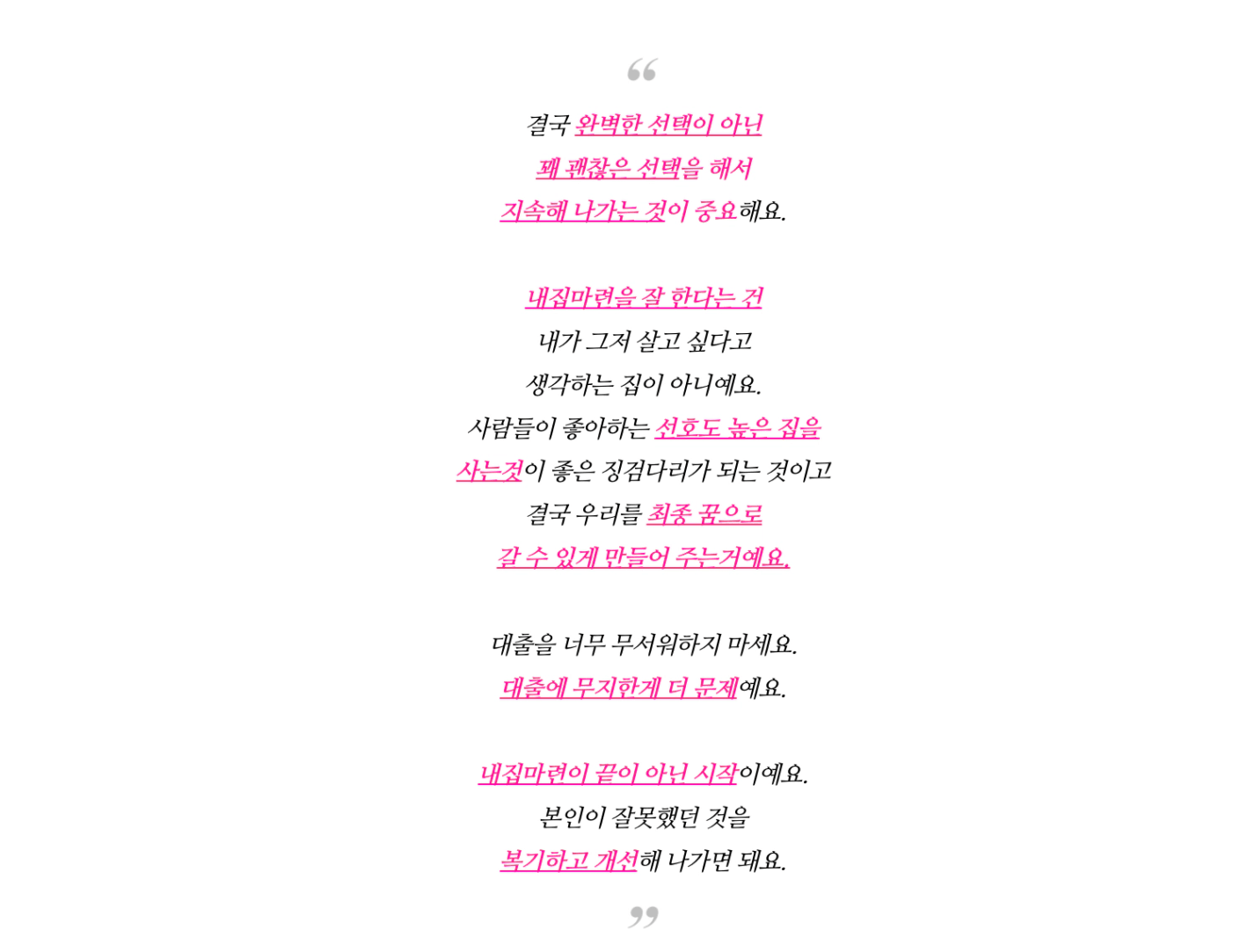 이번 강의의 주제가 내집마련이기에 이 강의를 들으시는 분들(저 포함)은 모두 이와 같은 마음일 것입니다. '빨리 내집마련하고 싶다', '빨리 이거 끝내고 싶다' 저 역시 예전에 마찬가지였습니다. 하지만 첫번째 내집마련을 하고 난 후 자본주의에 대해 더 많이 궁금해지고 제가 어떻게 하면 더 좋은 자산을 취득할 수 있는것에 대한 고민들이 커졌습니다. 그래서 제가 할 수 있는 부분에서 공부를 지속했고 첫번째 내집마련했을 때 제가 했던 행동들을 복기하면서 두번째 집을 매수할 때 조금 더 나은 선택을 할 수 있었다고 생각합니다. 다시 말해 한번으로 끝나는 것이 아닌 우리들의 최종목표를 위해 지속적인 행동을 해야 한다는 이야기인 것입니다. 한번에 최종 꿈으로 바로 갈 수 있으면 좋겠지만 우리들 모두 종잣돈이 많지 않은 월급쟁이들이기에 한 스탭 한 스탭 밟아가는 것이 중요하다고 생각합니다.