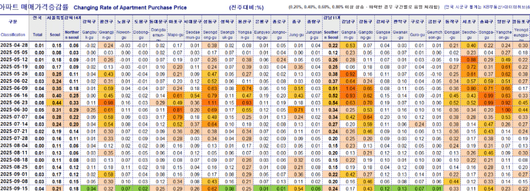 * KB주간 시계열 :(4,5급지만 아직 안오른 상태: 4급지 동대문도 상승불이 켜졌다)
