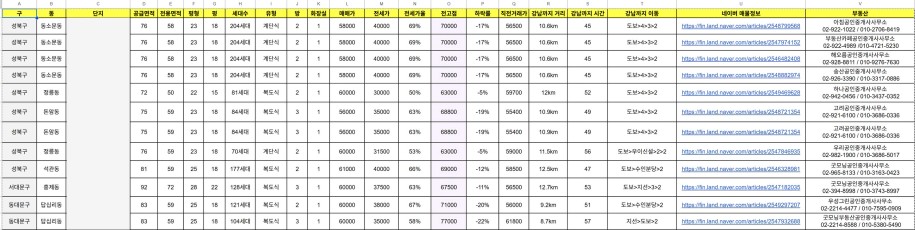 다랭 튜터님을 만나기 전, 먼저 제가 가고자 하는 지역을 확정하고 리스트를 작성하는 작업부터 진행해야 했습니다. 금융권 프리랜서 디자이너로서 제 주 업무 지역은 여의도, 광화문, 시청이었기에, 경기도로 가게 된다면 출퇴근의 제약이 클 것이 분명해 보였습니다. 결국 성북구, 동대문구, 서대문구, 이렇게 3구로 범위를 좁혀 다시 괜찮은 단지를 찾아보기 시작했습니다.