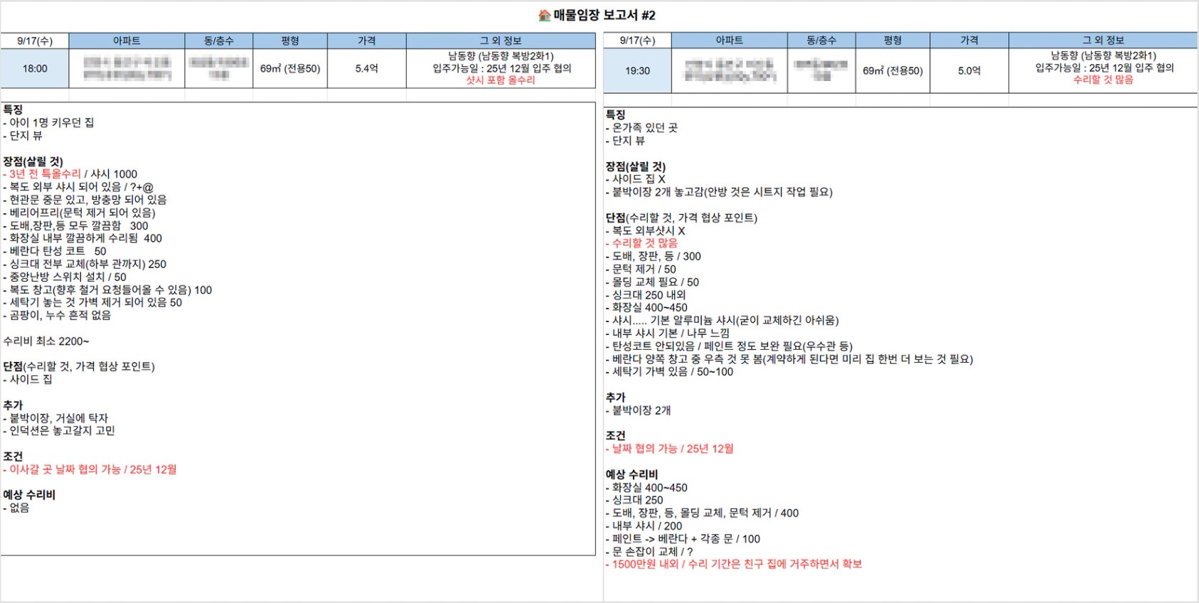 이어진 두 번째 매임은 11시에 본 인근 단지로, 세대수와 연식은 비슷했지만 월세 세입자가 거주 중인 상태였습니다. 생활 중인 집이라 꼼꼼히 확인하기는 어려웠지만, 튜터님과 최대한 체크해 보았습니다. 첫 집보다 수리할 부분이 많았지만 6억 예산에 맞는 매물이라 신중히 고민해 볼 필요가 있었습니다. 또 중도금을 먼저 지급하면 세입자가 11월 16일 퇴거한 뒤 곧바로 입주할 수 있도록 협의 가능하다는 이야기도 있었습니다. (전세 만기는 11월 4일이라 그 사이 단기 임대를 고민하던 상황이었습니다.)