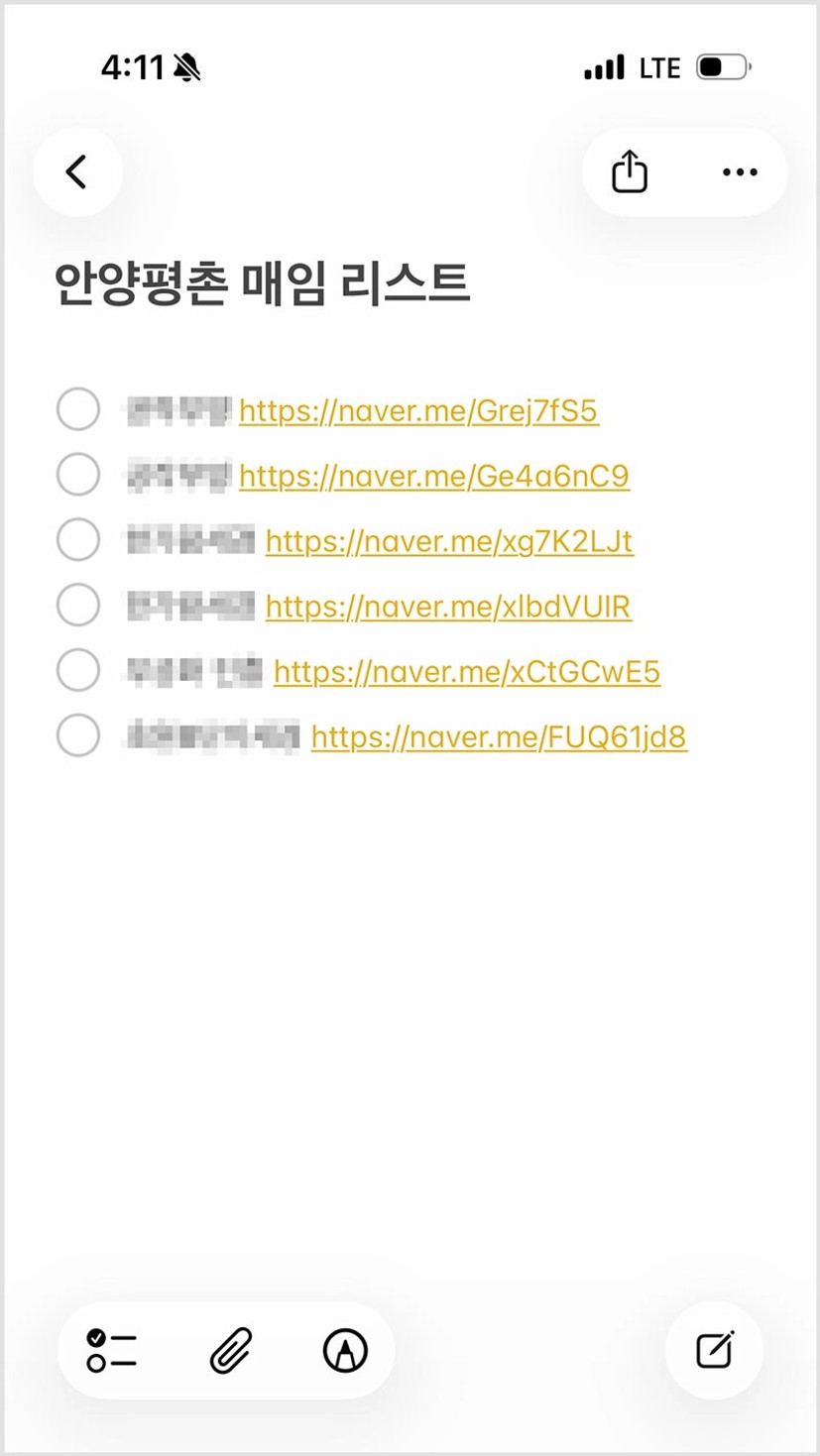 그 중 안양 평촌과 광명 철산 두 지역을 두고 비교했는데, 예전 중개사님과의 매칭 당시 안양을 관심 있게 둘러보았던 터라 더 맘에 들기도 했고, 예산에 맞는 매물도 많아 우선순위로 삼게 되었습니다. 그래서 리스트를 새롭게 추가해 나가기 시작했습니다.