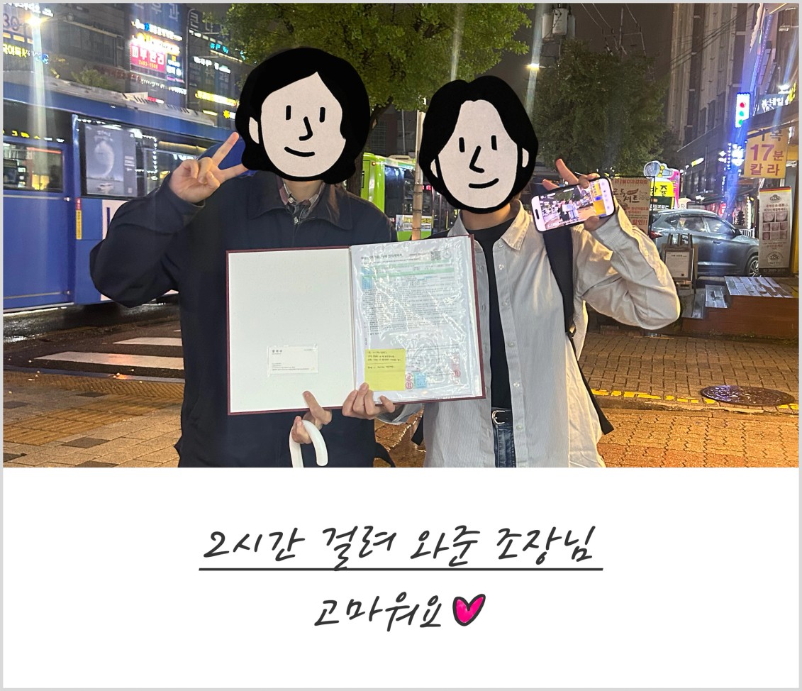 하지만 끝날 때 까지 끝난게 아니죠.. 설레기도 두렵기도 한 계약 당일이 4일 후 다가왔습니다. 내마중 조원들과 계약 전 특약 사항에 대해 새벽까지 문자를 주고 받다가 결국 계약 당일 1시간도 채 눈을 붙이지 못하고 업무를 마친 후 부동산으로 향했습니다. 함께 밤을 새우다시피 하며 제가 미처 꼼꼼히 체크하지 못했던 부분을 찾아주시고, 누수 관련 사항에 필요한 특약 문구까지 월부 커뮤니티에 직접 글을 남겨 알아봐주신 조장님 덕분에 마음 든든하게 부동산으로 향할 수 있었습니다. 이날 아쉽게도 다랭튜터님께선 튜터링데이(?)로 오시지 못하셨지만 월부의 대표 장지수 중개사님 함께 오셔서 계약을 진행하였습니다. 전자계약서로 어플을 통해 진행 되었는데, 처음 해보는 매매계약이라 너무 떨리기도 하고, 잠을 한 숨도 못 잔 상황에서 진행 하다 보니 정신 없이 흘러 갔던 것 같습니다. 그래도 도와주신 중개사님과 심리적 안정감을 더해준 조장님 덕분에 아무 사고 없이 잘 마무리 할 수 있었네요.