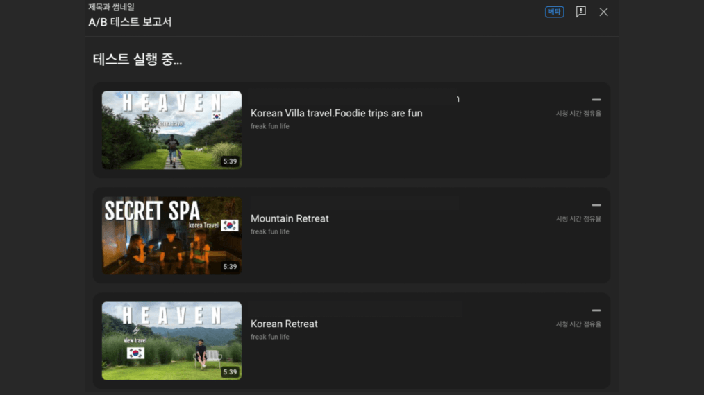 유튜브 스튜디오에 A/B 테스트 기능이 생겼습니다. 제목과 썸네일을 여러 버전으로 테스트해서 어떤 게 더 잘 먹히는지 확인할 수 있어요.