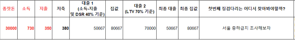 종잣돈은 전세집 보증금과 저축을 뺀다면 3억이고 소득은 730에 지출350, 그래서 저축은 380 정도 되는것 같아.