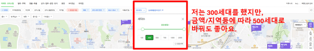 아파트, 원할때 환금성도 중요한법. 서울기준으로 300세대 이상으로 필터를 걸어봤어요.