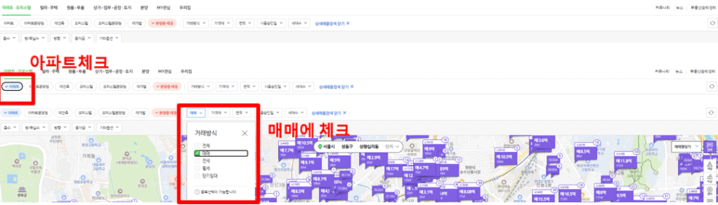 아파트와 매매에 체크를 합니다(내가 원치않는 전월세, 오피스텔등의 물건이 같이 뜨지않게)