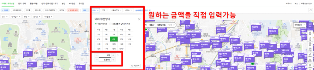내가 원하는 금액을 직접 입력해요(예시는 8억이라 저는 80000~87000으로 설정했습니다)