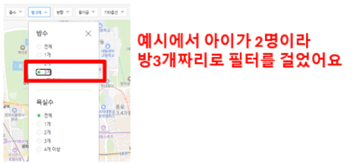 예시에서 아이가 두명이라 방3개로 필터를 걸었어요. 기타옵션에서 방,화장실갯수등 설정할수 있답니다