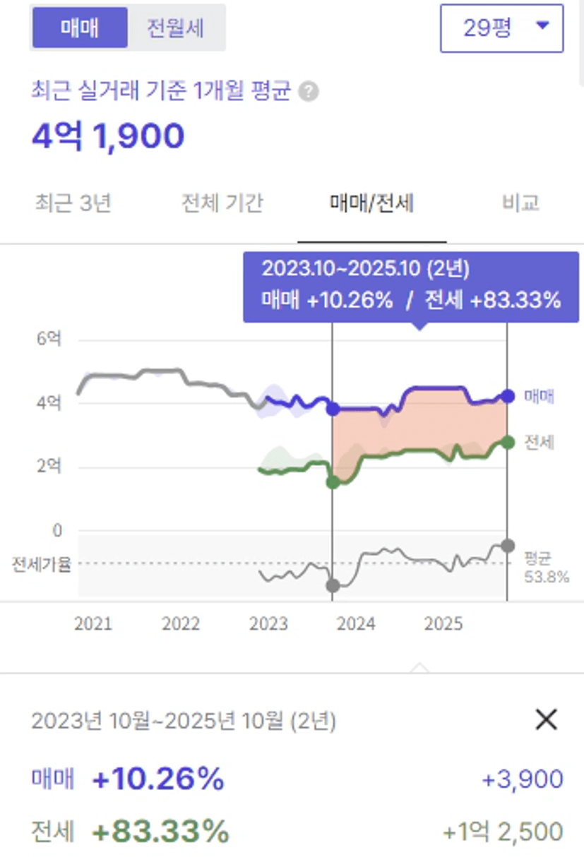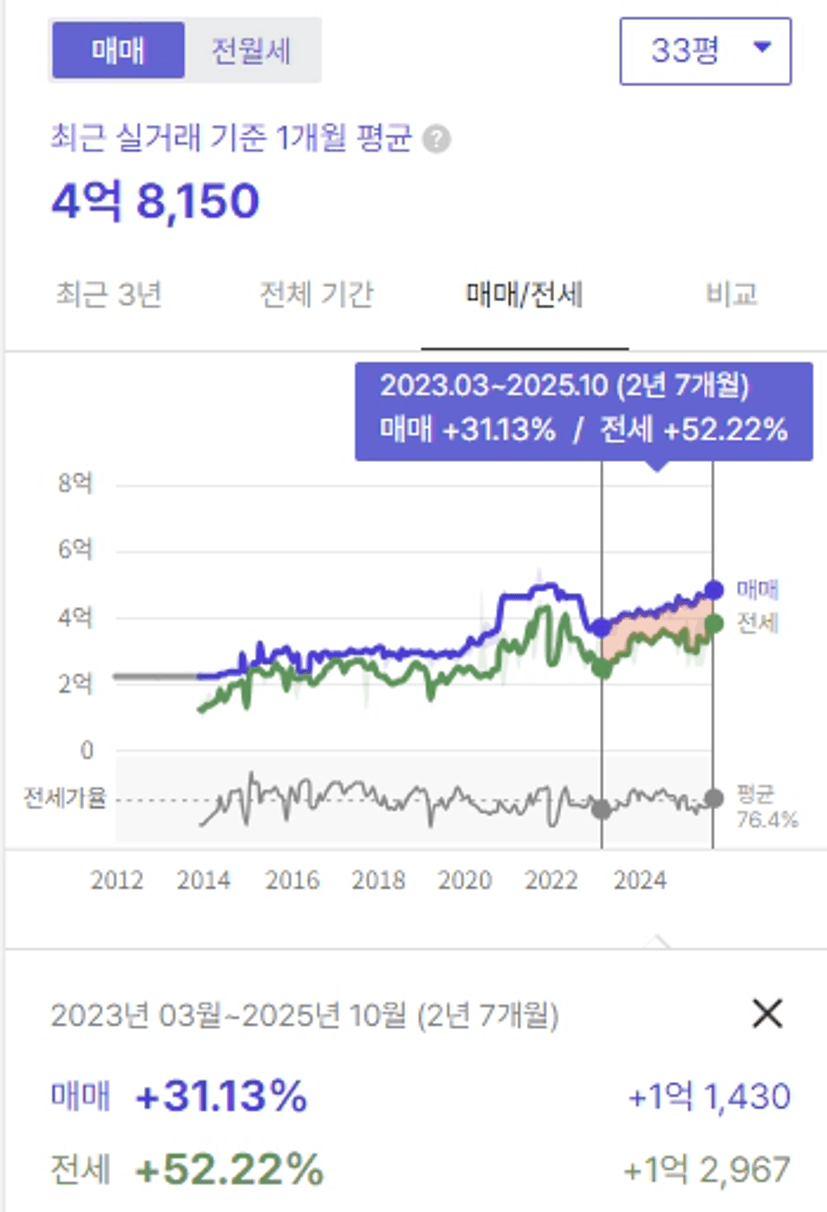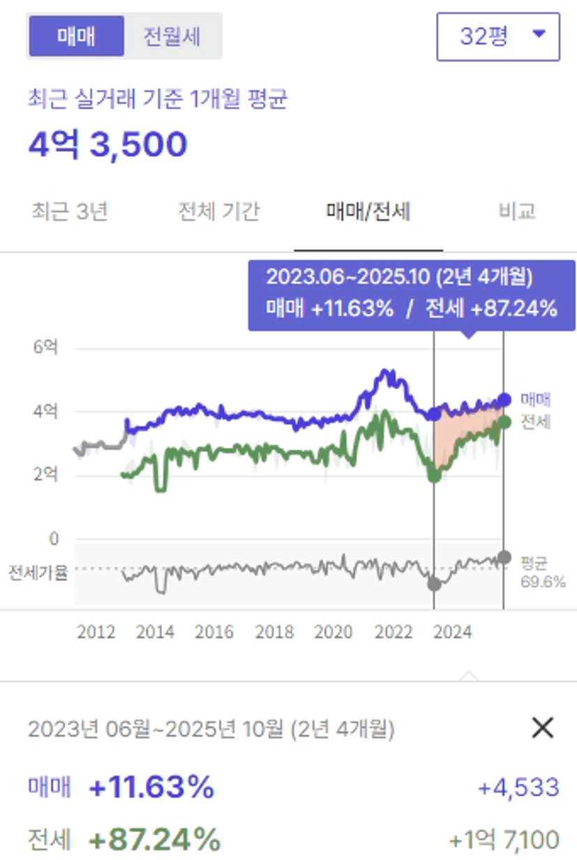 정리가 되면서 24년도쯤 한 단계 큰 폭으로 전세가가 상승하였고,