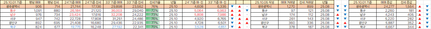 광주는 매매가가 지난 달에 비해 여전히 하락한 모습,