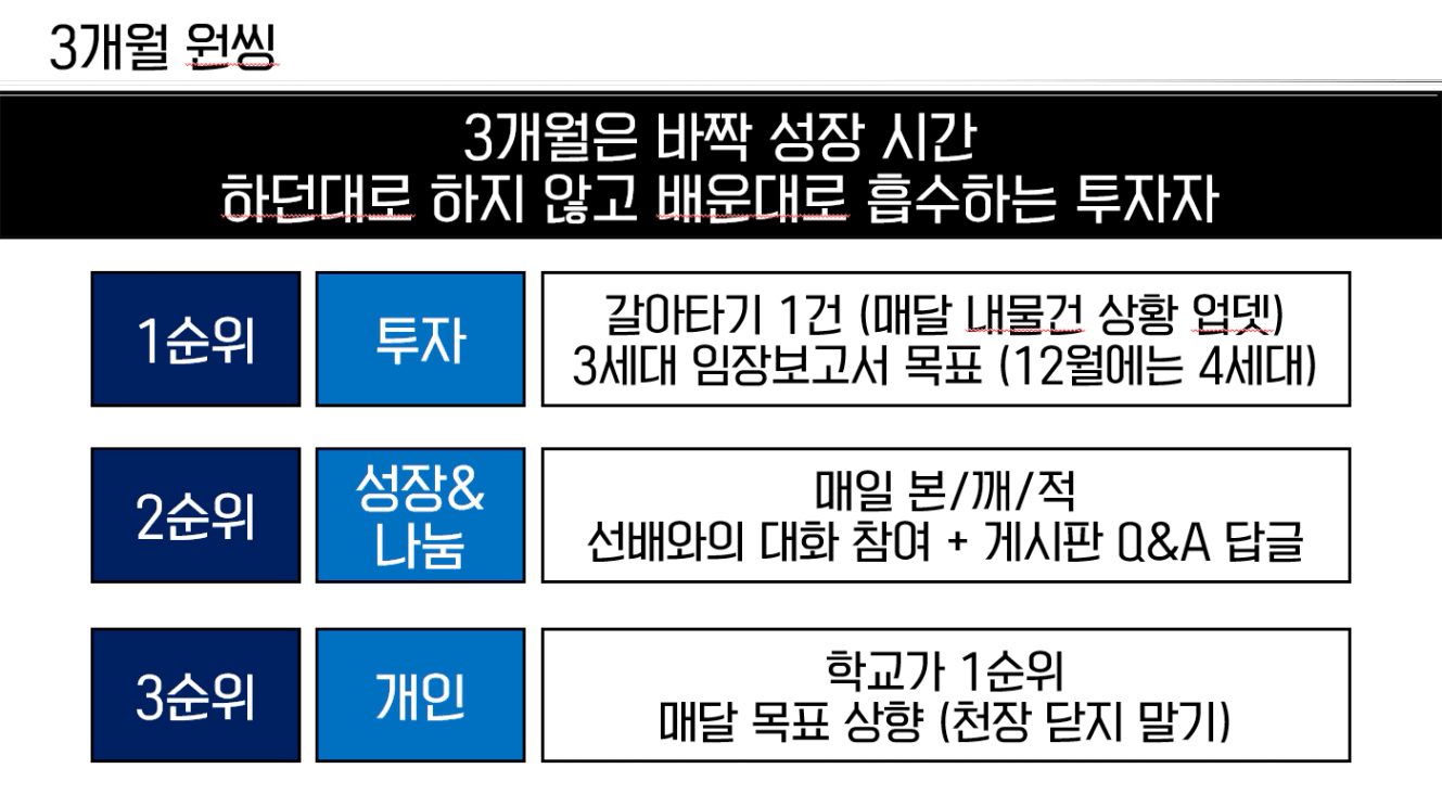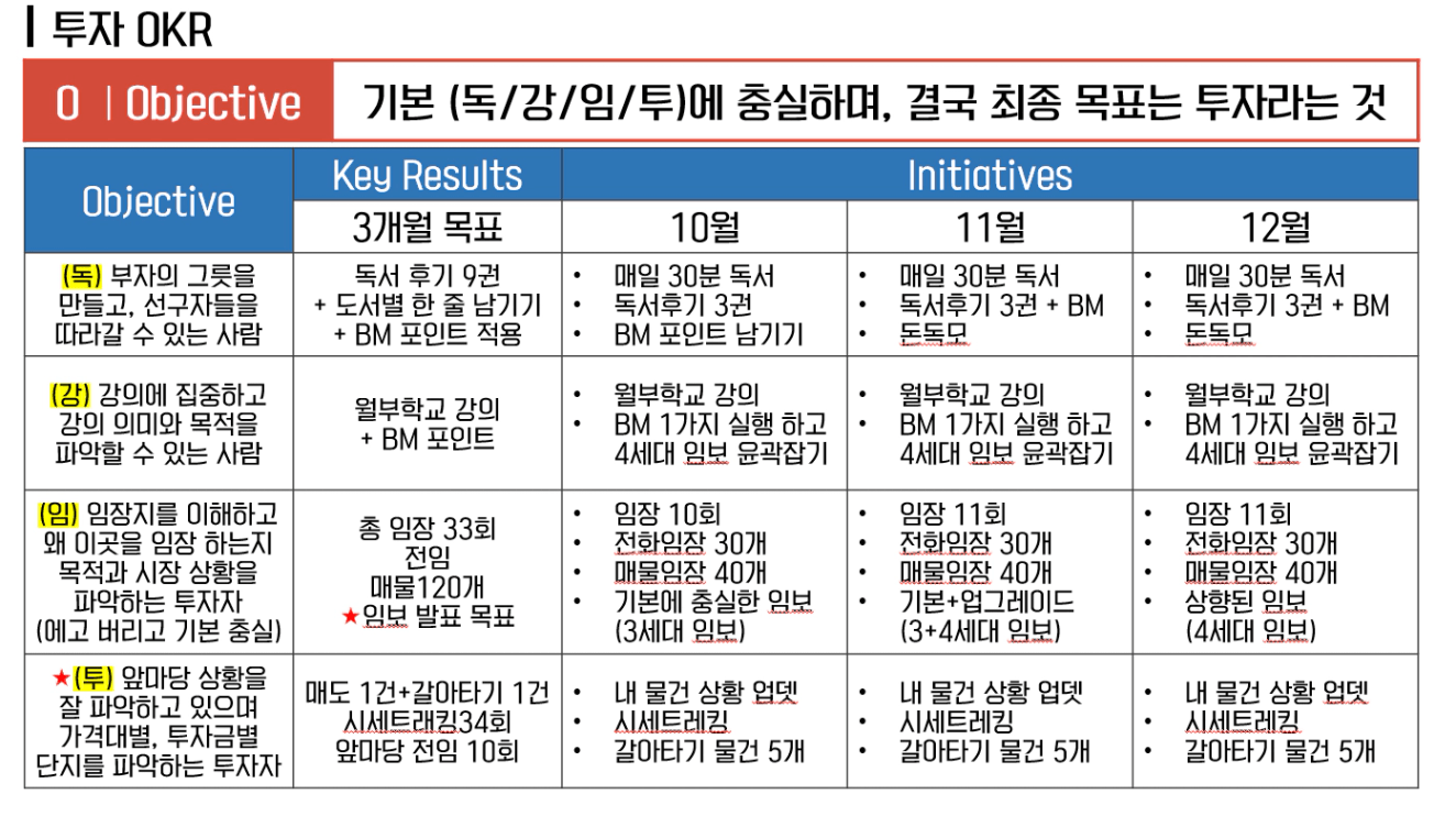 독서 유지/강의 2일 이내 수강 완료 및 후기 남기기/ 임장 (분임-단임-매임-결론)/ 투자 (내 물건 현황 파악-대략)