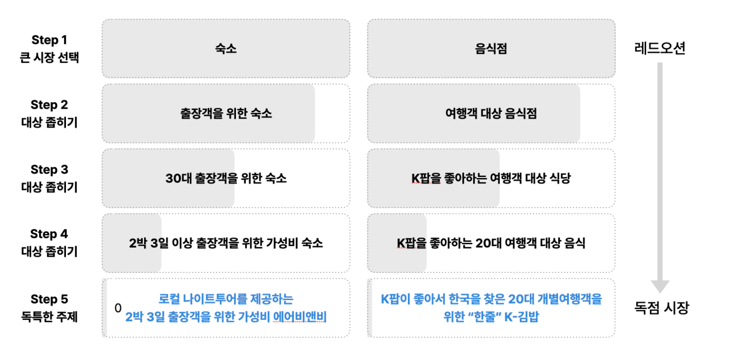 예를 들어 숙박업을 한다면, 그냥 "숙박업"은 위험하고요. "출장객을 위한 숙소"로 좁혀야 해요. 거기서 더 좁혀서 "30대 출장객"으로, 다시 "2박 3일 이상 출장객을 위한 가성비 숙소"로 계속 좁혀가는 거예요. 여기에 "로컬 나이트 투어 제공"까지 붙이면 완전히 다른 사업이 됩니다.