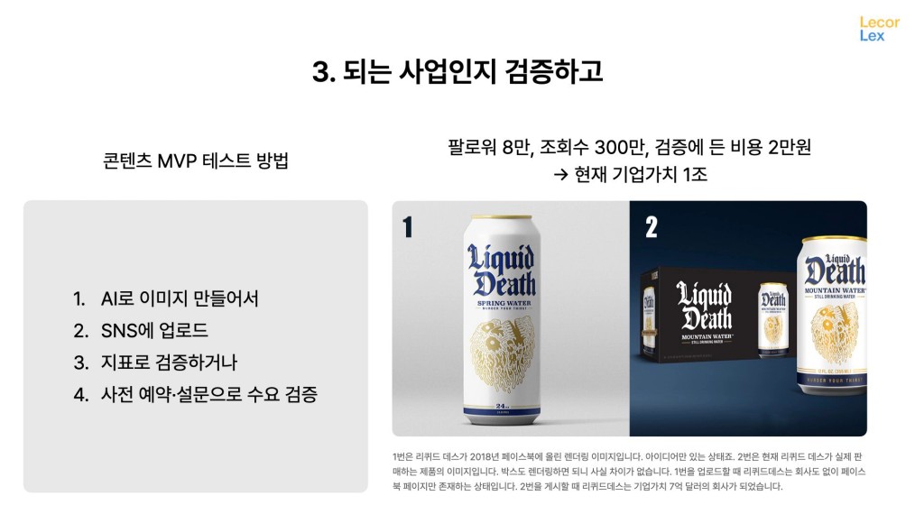 실제로 많은 회사들이 이렇게 하고 있습니다. 화장품 브랜드도 틱톡에 올려서 터지면 그때 제조해요. AI로 뚝딱 만든 이미지를 올려서 검증한 뒤에 만드는 것과 실제 제품을 만들어서 틱톡에 올려서 홍보하는 것 중 뭐가 돈이 덜 들까요? 뭐가 성공확률이 높을까요? 이것이 콘텐츠 MVP테스트예요. 저도 얼마전 컨설팅한 주류 회사에서 이런 방법으로 검증했고 생산에 들어갔습니다.