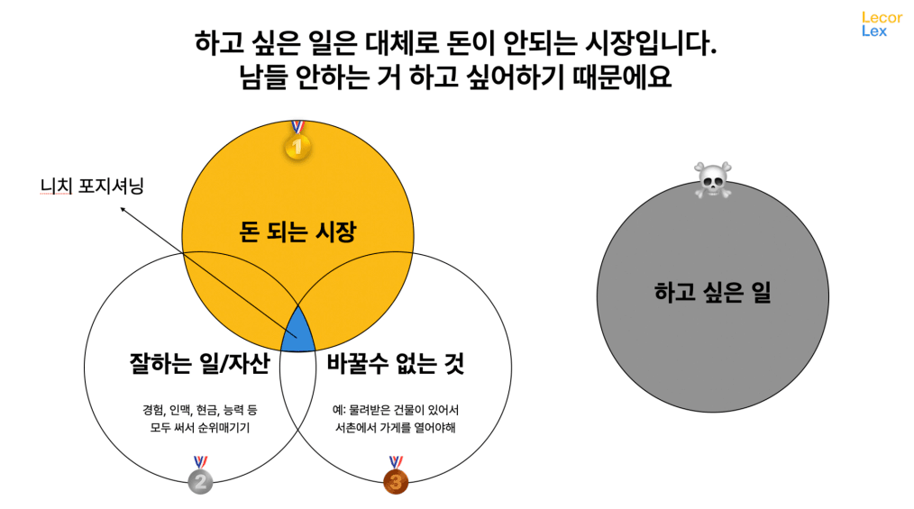 돈 되는 시장에서 내가 잘하는 일의 교집합을 찾는 것이 핵심입니다. 이걸 파운더 마켓 핏(Founder Market Fit)이라고 하는데, 내가 잘하는 것과 시장이 원하는 것이 딱 맞아떨어져야 해요. 이게 안 맞으면 아무리 열심히 해도 돈은 발생하지 않습니다.