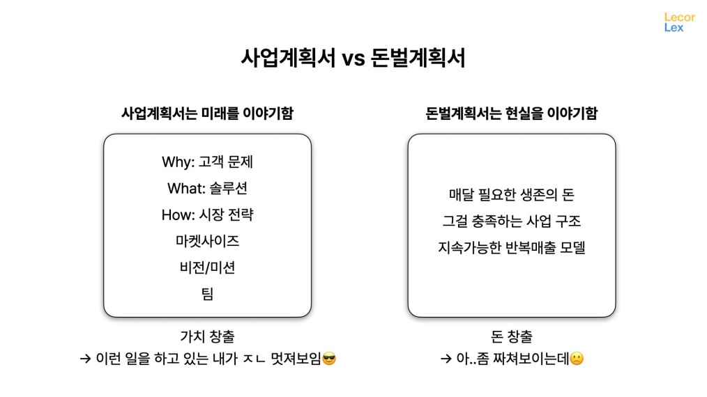 반면 돈벌계획서는 현실을 이야기하며 매달 필요한 생존의 돈, 그걸 충족하는 사업 구조, 지속가능한 반복매출 모델에 집중합니다. 잠시도 거창하고 허황될 틈이 없습니다.