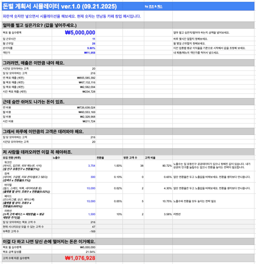시뮬레이터를 드립니다. 벌고 싶은 금액과 현실 숫자들을 넣으며 실제 내 손에 얼마가 떨어지는 지 한번 확인해 보셔요. 이 시뮬레이터의 실제 르코&렉스가 별건의 컨설팅에서 사용하는 자료로 백데이터 근거가 있습니다. 현재 기입된 각 계정(영업이익, 객단가, 전환율 등)의 값은 업계 평균이지만 임의 숫자입니다. 기준점으로만 보시고 당연히 나의 전략과 역량에 따라 조정되어야 하는 값입니다. 가령, 식당을 하면 순이익율이 6~8%정도 됩니다. 이건 통계적 숫자이고 어떤 곳은 2-30%도 만들수 있죠.